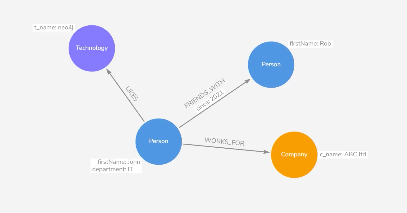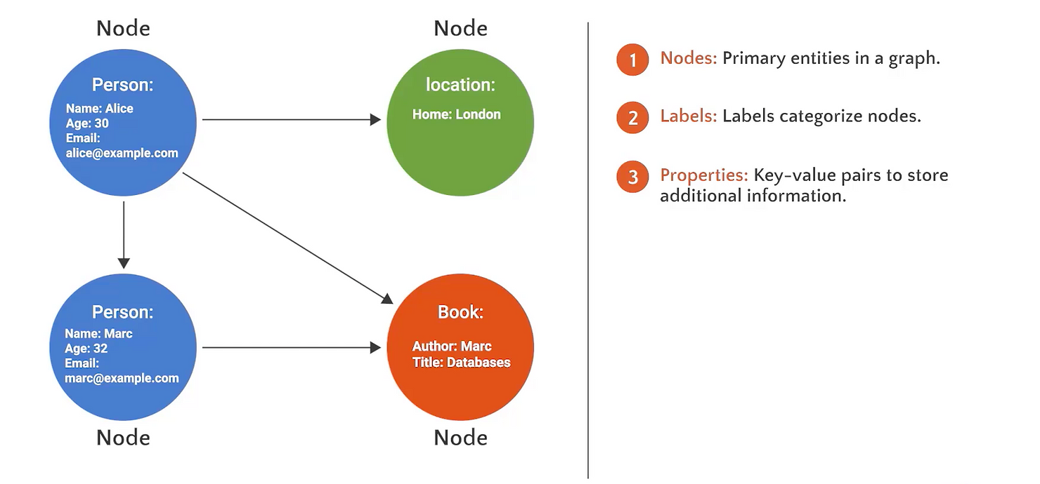 Nodes can also have properties, which are key-value pairs that store additional information about the node. For example, a person node might have properties like: