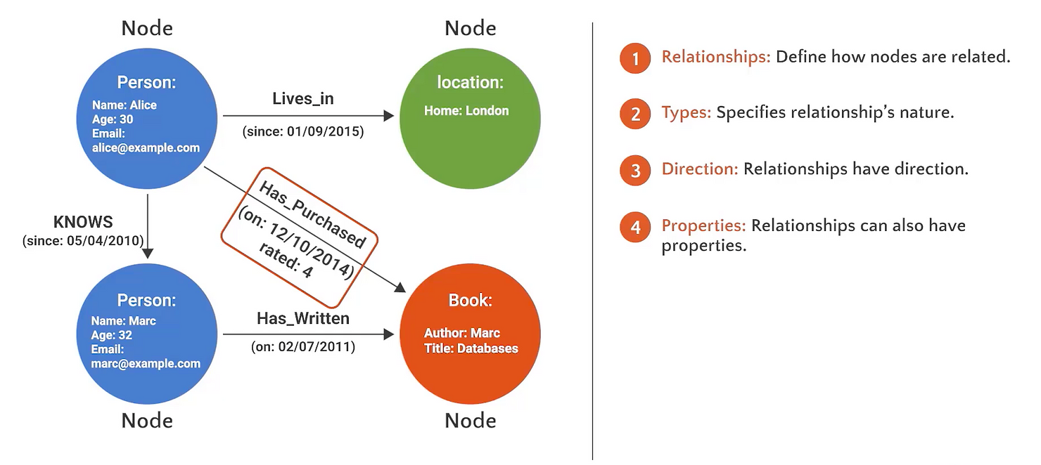 Relationships can also have properties. For example, a "PURCHASED" relationship might have a date property indicating when a purchase happened.